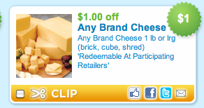 $1/1 Any Brand Cheese 1 lb + (brick, cube, shred) --- This is old and you might have already hit your limit on it. Use zip code 32807