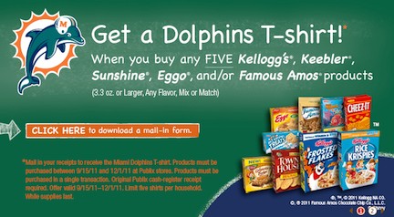 You can get a Dolphins T-shirt (size: youth large) when you buy any FIVE Kellogg’s®, Keebler®, Sunshine®, Eggo®, and/or Famous Amos® products (3.3 oz. or Larger, Any Flavor, Mix or Match)