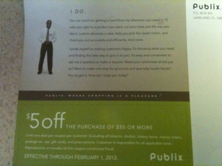 Couponaholic got a Publix mailer with a coupon attached. The mailer had a $5 off $50 coupon that is valid though 2/1/12. Not all places got this... but it is a sure sign that others should be soon!